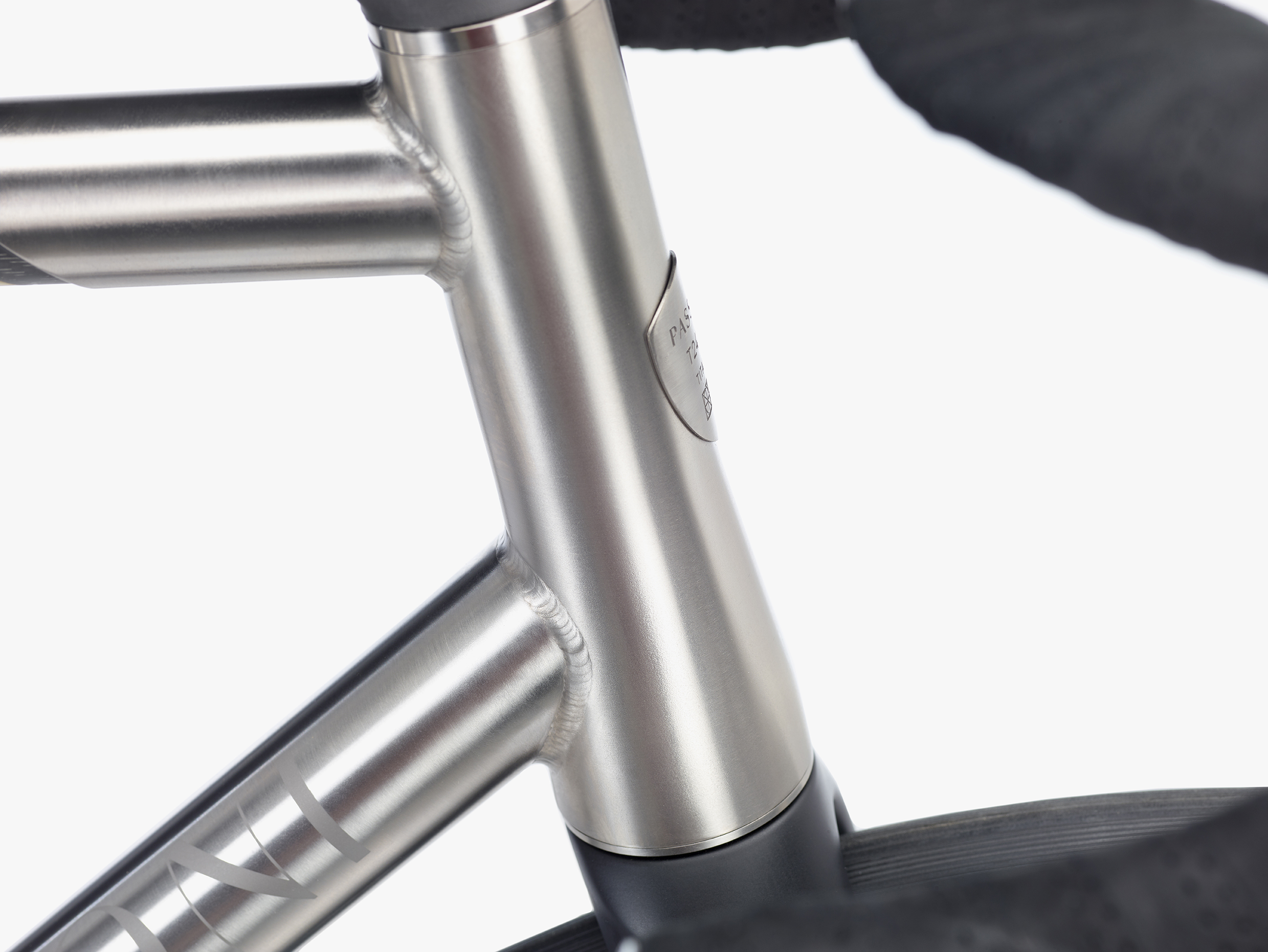 Saldature a vista, tubi rifiniti mediante sabbiatura con perle di vetro, grafiche applicate direttamente sui tubi in titanio mediante processo di anodizzazione.